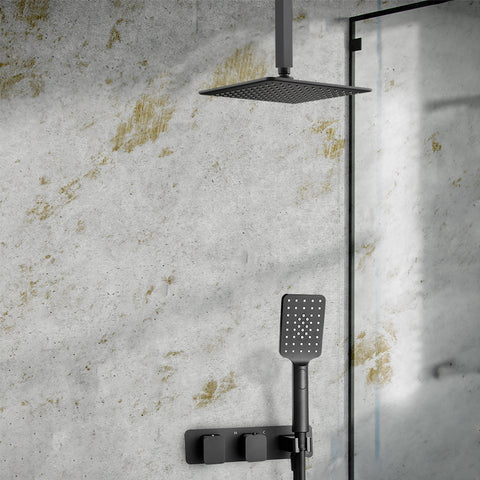 Introduce a touch of sophistication to your bathroom with this modern dual outlet shower system, a gem in the range of concealed shower valves. This 2 outlet shower valve handset is beautifully crafted from brass with a black matt finish, blending the allure of classic design with modern functionality. Its wall-mounted design, featuring a horizontal rectangular plate and dual control lever handles, exemplifies style and practicality.