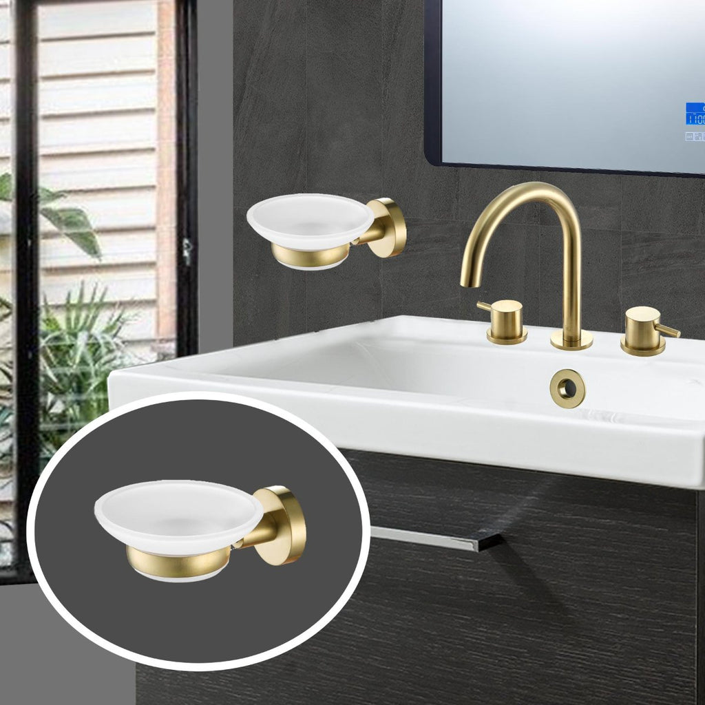 As a contemporary design, the round dish holder is easy to install and clean and keeps your space free from soap residue and clutter that can ruin the entire feel and ambience. With a height of 53mm and a projection of 118mm, this brass soap dish is a space-saving design distinguished by the frosted glass material.